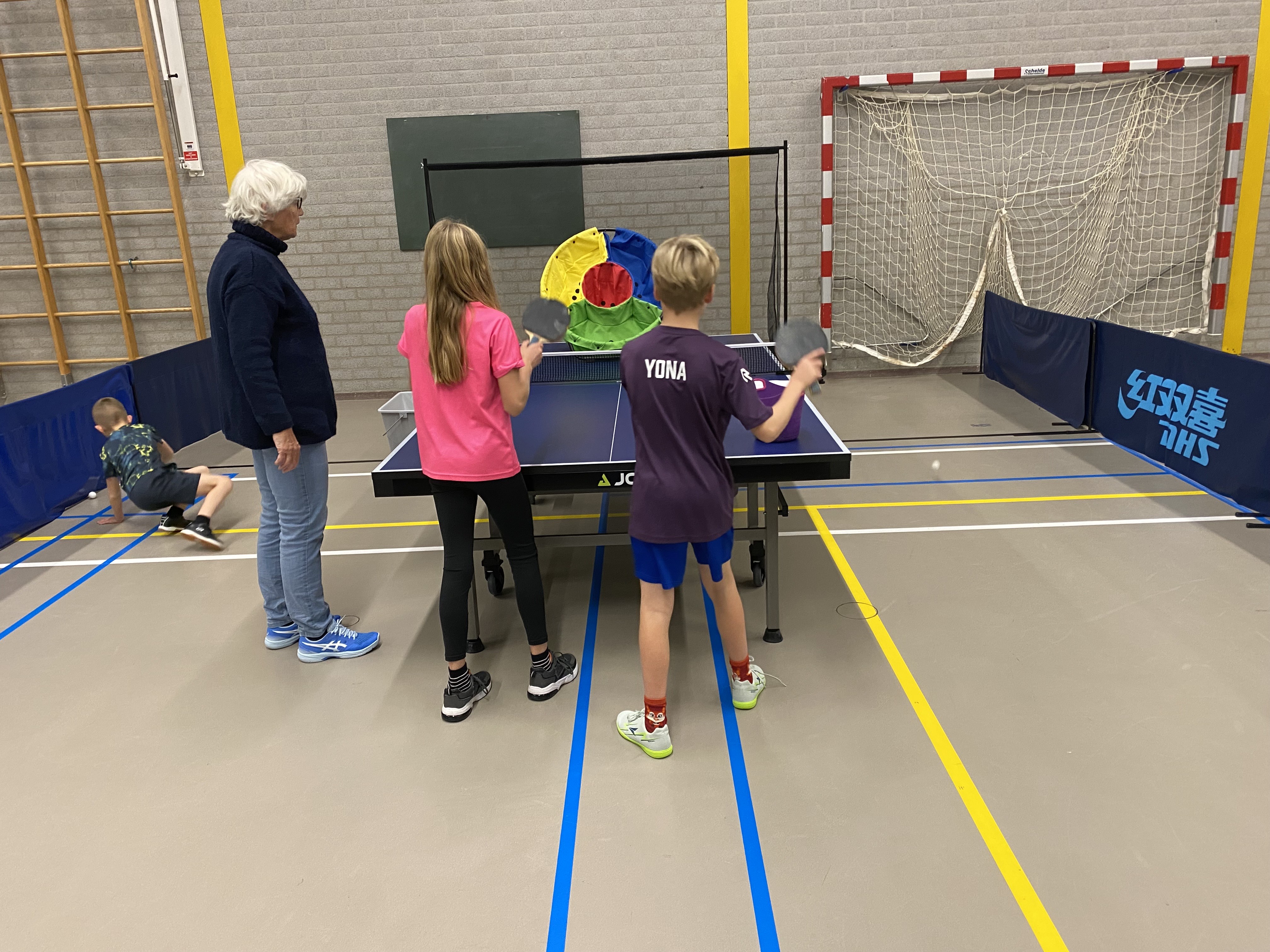 In totaal deden er bijna 100 kinderen aan mee en er was voor hun een speelcircuit met 6 verschillende oefeningen uitgezet. Een aantal oefeningen bestond o.a. uit het bekende spel boter-kaas en eieren, mikken op de roos en het spelen tegen de tafeltennisrobot. Voor de kinderen uit groep 1-2 was het best spannend om tegen de robot te spelen. De kinderen waren allemaal zeer enthousiast en kregen na de les allemaal nog een tafeltennisbat-sleutelhanger mee als aandenken aan deze leuke sportles. Mede door de inzet van de vrijwilligers van T.T.V. TALO, de sportleraar en de beide basisscholen is dit weer een leuke, gezellige en sportieve dag geworden.